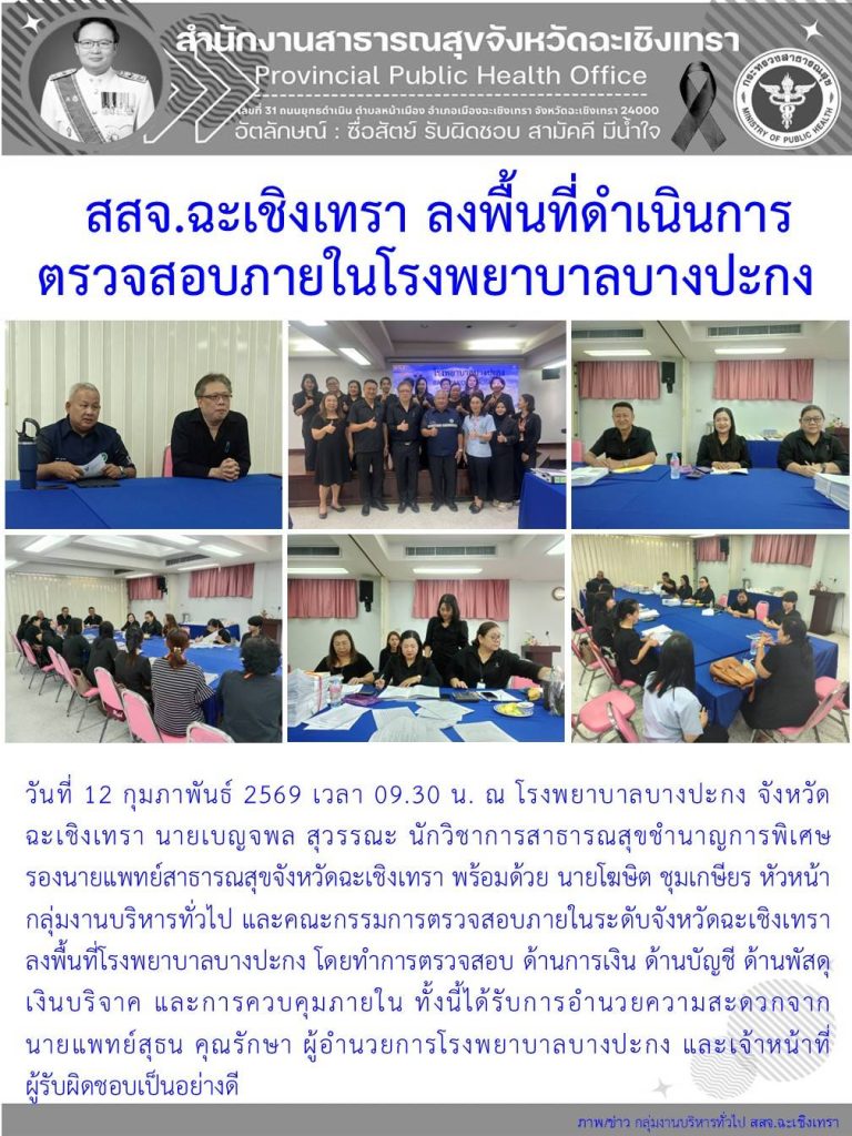 วันที่ 12 กุมภาพันธ์ 2569 เวลา 9.30 น. ณ โรงพยาบาลบางปะกง จังหวัดฉะเชิงเทรา นายเบญจพล สุวรรณะ นักวิชาการสาธารณสุขชำนาญการพิเศษ รองนายแพทย์สาธารณสุขจังหวัดฉะเชิงเทรานายโฆษิต ชุมเกษียร หัวหน้ากลุ่มงานบริหารทั่วไป พร้อมด้วยคณะกรรมการตรวจสอบภายในระดับจังหวัดฉะเชิงเทรา ลงพื้นที่โรงพยาบาลบางปะกง โดยทำการตรวจสอบ ด้านการเงิน ด้านบัญชี ด้านพัสดุ ยาและเวชภัณฑ์มิใช่ยา เงินบริจาค และการควบคุมภายใน ทั้งนี้ได้รับการอำนวยความสะดวกจากผู้อำนวยการโรงพยาบาลบางปะกง และเจ้าหน้าที่ผู้รับผิดชอบเป็นอย่างดี