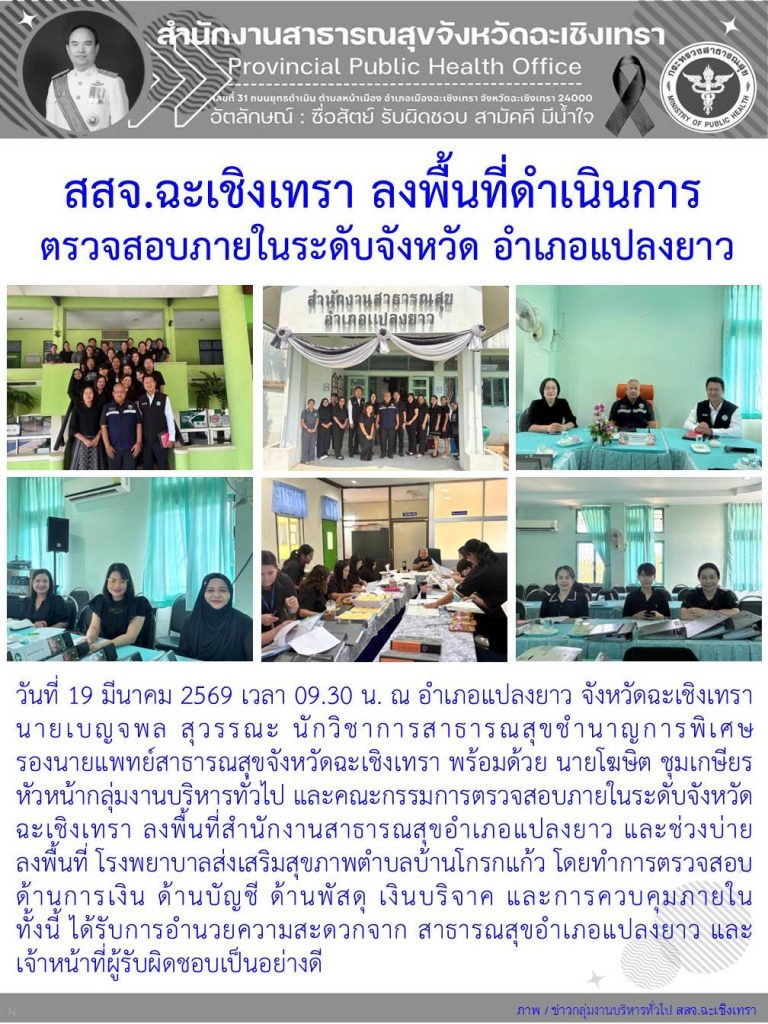 วันที่ 19 มีนาคม 2569 เวลา 9.30 น. ณ อำเภอแปลงยาว จังหวัดฉะเชิงเทรา นายเบญจพล สุวรรณะ นักวิชาการสาธารณสุขชำนาญการพิเศษ รองนายแพทย์สาธารณสุขจังหวัดฉะเชิงเทรานายโฆษิต ชุมเกษียร หัวหน้ากลุ่มงานบริหารทั่วไป พร้อมด้วยคณะกรรมการตรวจสอบภายในระดับจังหวัดฉะเชิงเทรา ลงพื้นที่สำนักงานสาธารณสุขอำเภอแปลงยาว และช่วงบ่ายลงพื้นที่ โรงพยาบาลส่งเสริมสุขภาพตำบลบ้านโกรกแก้วโดยทำการตรวจสอบ ด้านการเงิน ด้านบัญชี ด้านพัสดุ เงินบริจาค และการควบคุมภายใน ทั้งนี้ได้รับการอำนวยความสะดวกจากสาธารณสุขอำเภอแปลงยาว และเจ้าหน้าที่ผู้รับผิดชอบเป็นอย่างดี