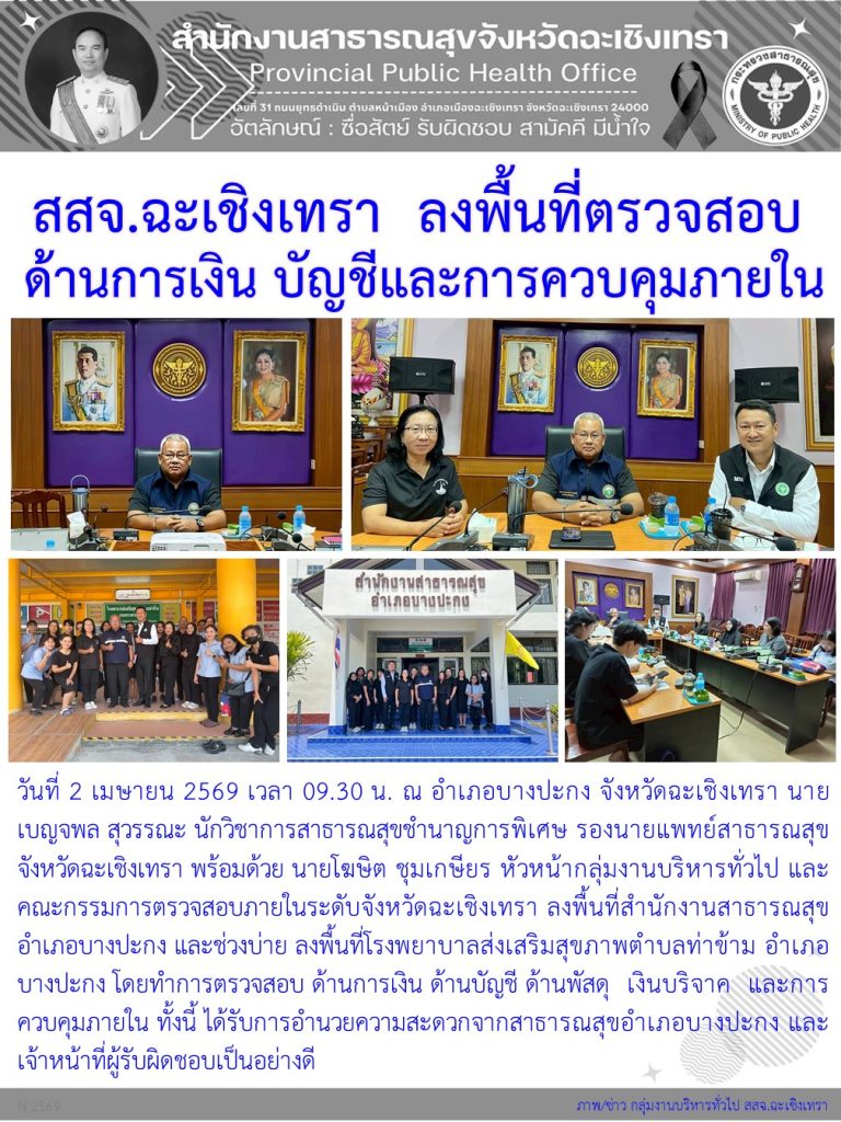 วันที่ 2 เมษายน 2569 เวลา 9.30 น. ณ อำเภอบางปะกง จังหวัดฉะเชิงเทรา นายเบญจพล สุวรรณะ นักวิชาการสาธารณสุขชำนาญการพิเศษ รองนายแพทย์สาธารณสุขจังหวัดฉะเชิงเทรา นายโฆษิต ชุมเกษียร หัวหน้ากลุ่มงานบริหารทั่วไป พร้อมด้วยคณะกรรมการตรวจสอบภายในระดับจังหวัดฉะเชิงเทรา ลงพื้นที่สำนักงานสาธารณสุขอำเภอบางปะกง และช่วงบ่ายลงพื้นที่ โรงพยาบาลส่งเสริมสุขภาพตำบลท่าข้าม โดยทำการตรวจสอบ ด้านการเงิน ด้านบัญชี ด้านพัสดุ เงินบริจาค และการควบคุมภายใน ทั้งนี้ได้รับการอำนวยความสะดวกจากสาธารณสุขอำเภอบางปะกง และเจ้าหน้าที่ผู้รับผิดชอบเป็นอย่างดี